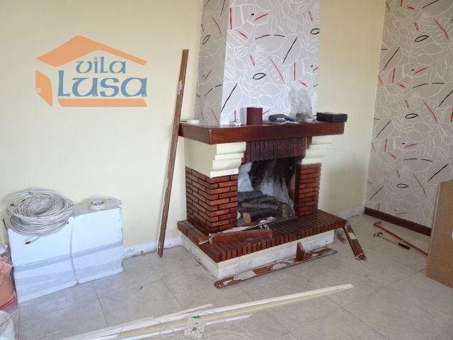 Sala com lareira e varanda.