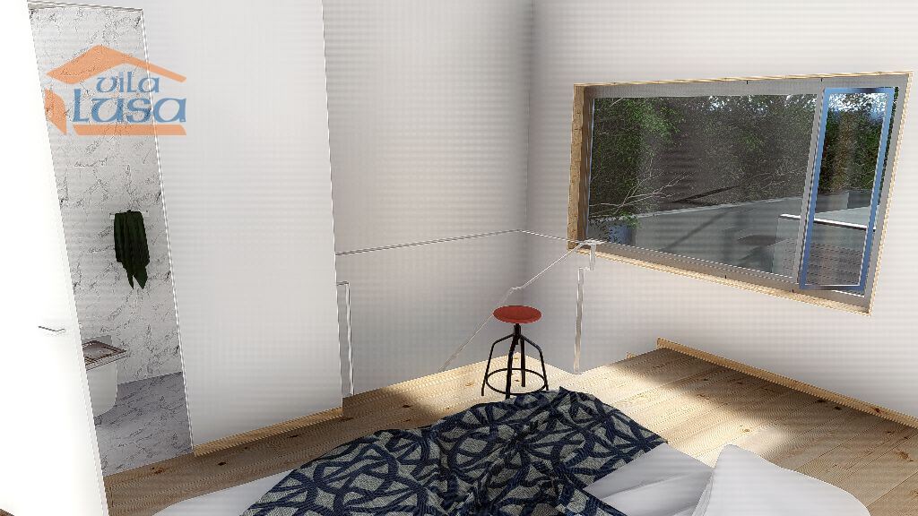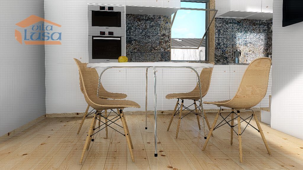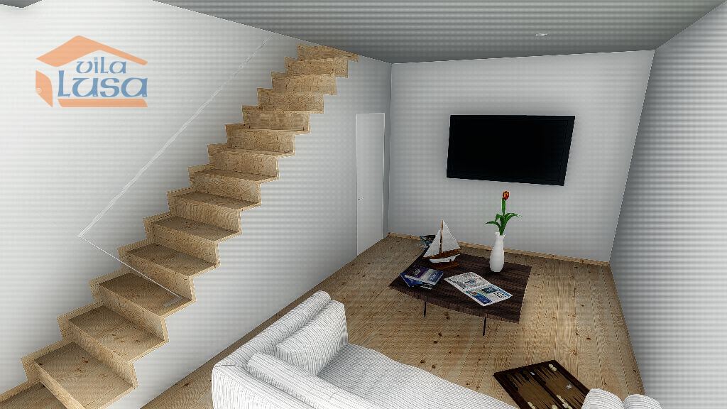 Pavimento ao nível do rés-do-chão e primeiro andar é constituído por soalho de pinho numa espessura de 22mmx12cm por 2,60m, com tratamento autoclave e acabado com verniz da Cin modelo Durocin.