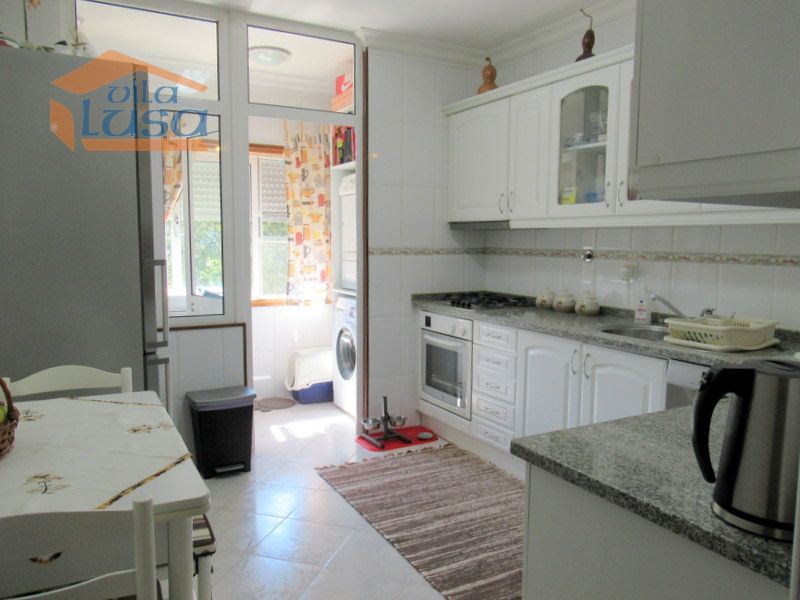 Sala com varanda e salamandra, cozinha com móveis lacados tampo em granito equipada com placa; forno; exaustor; despensa, lavandaria independente.